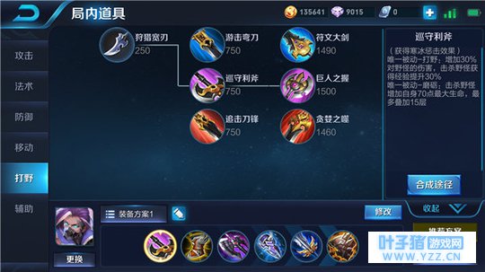 前期:先买狩猎宽刃,击杀野怪快速提升等级,之后合成巡守利斧击杀野怪增加自身生命值。随后合成疾步之靴,配合隐身游走抓人能力极强。