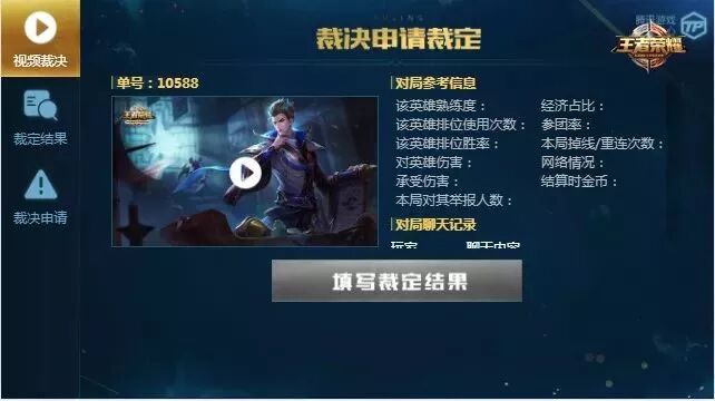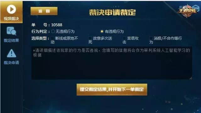 ③根据回放视频、结算数据、聊天记录、历史举报等数据,对巅峰赛中被举报召唤师的行为给予裁定建议。