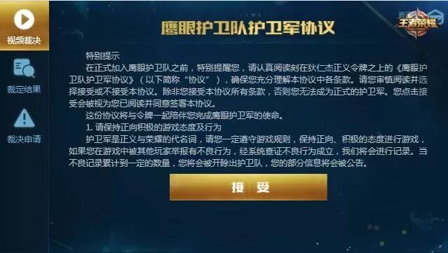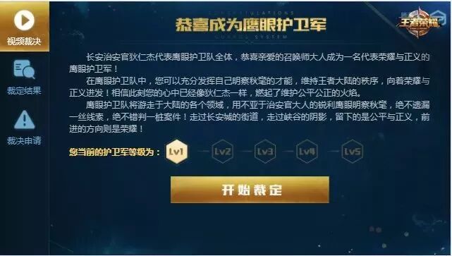 鹰眼护卫队试行一段时间后,会 扩大招募名额 和 范围 。让更多心怀正义的召唤师,参与到维护王者大陆的公正秩序中来。鹰眼护卫军将走过王者大陆的每一个角落,发挥榜样效应,树立 行为定义 ,维护 正义与公平 !