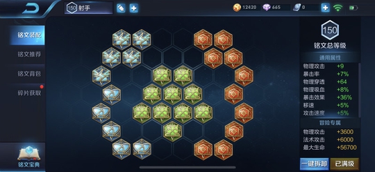 这套铭文是要吸血有吸血,要破甲有破甲,最后还有无双的双重暴击配合上上面的出装可以让伽罗的暴击达到一定的峰值,这套铭文可能在前期的时候看不出太多的效果,一旦从12分钟后伽罗的装备成型这套铭文效果就发挥出来了。
