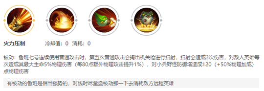 首先作为一个切后排的射手,鲁班的平A的很重要,尤其是他释放技能后的被动,就是类似机关枪的连续扫射,鲁班非常依赖这个被动,基本上技能都是靠被动引出,无论是清兵还是偷塔,前后期的帮助都非常的大。另外鲁班的二技能也很重要,很多时候不经意就抢了人头,这方面再玩的时候也要注意,如何大概率提高使用二技能拿到击杀数。
