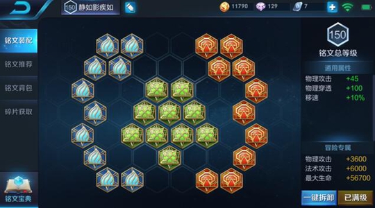 蓝色隐匿X10,绿色鹰眼X10,红色异变X10,这套符文给他增加大量的攻击值,帮助他快速发育,其中穿插着还有移速的加成。