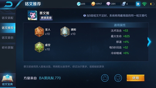 10个圣人10个虚空10个调和,这套铭文不仅可以增加大量血量,而且其可以提供不错的法术加成能让前期蔡文姬大招回复效果更加明显,而且减cd在前期也是十分管用的。