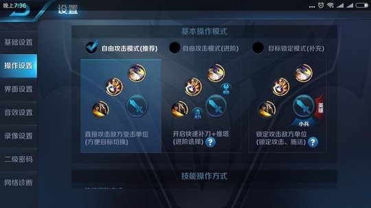 接下来是基本操作模式:有三种。建议选择自由攻击模式,原因是这种模式操作比较自由,不会出现目标锁定之后不更换目标的话会一直打肉,或者打小兵,或者打野怪的情况。