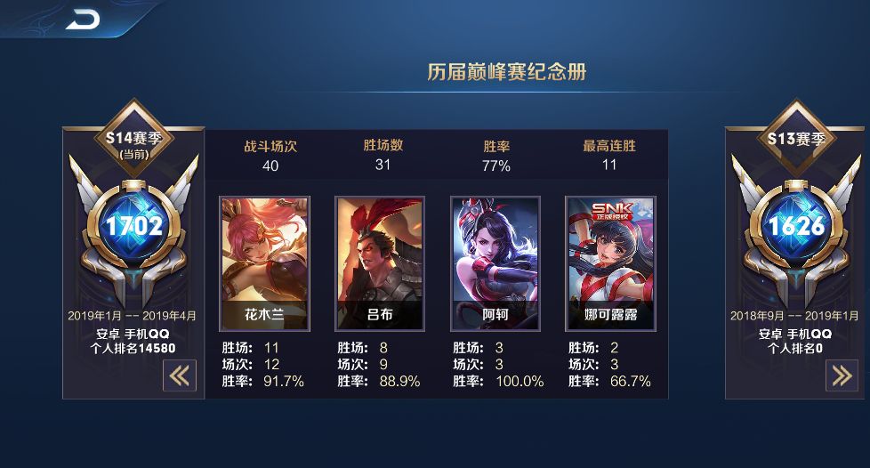 首先大家可以发现我基本是靠边路战士和打野上分的,打野主要玩阿珂和露露,边路就用的比较极端,即用当前版本下水道英雄花木兰,也用版本强势T0边路吕布,花木兰纯粹属于自己的拿手英雄,吕布属于顺应版本的选择。