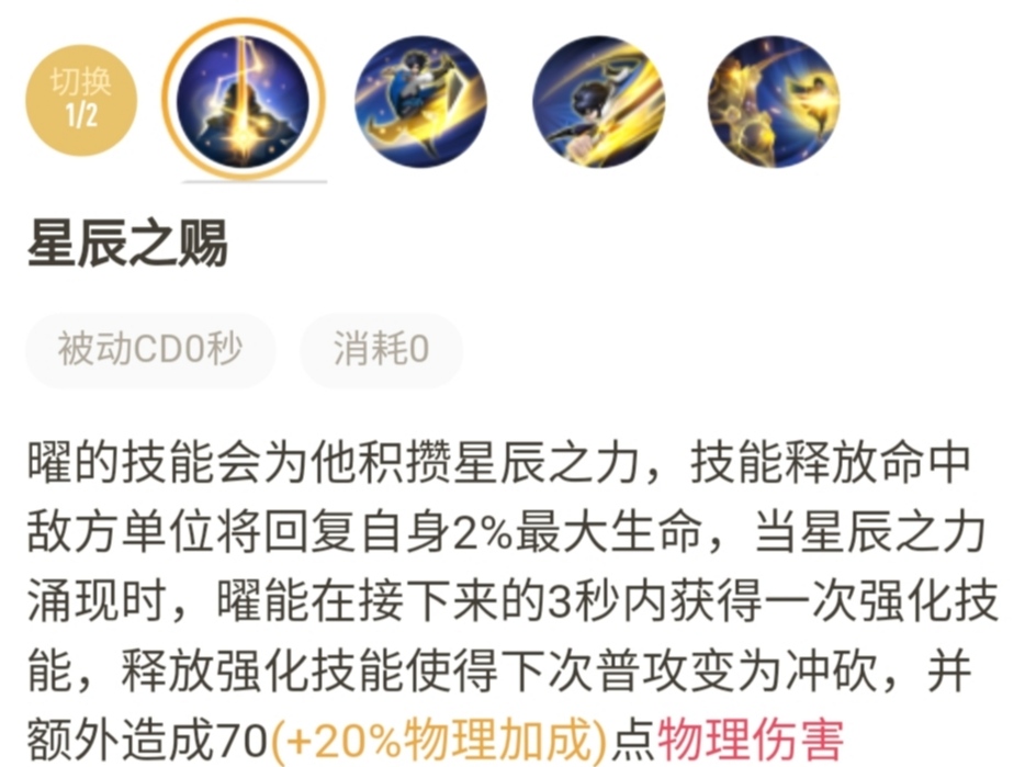 曜的主要输出来源就是曜的被动技能——星辰之赐。曜只要释放技能就会为自己蓄好一层星辰能量,当能量到达第三层的时候就会自动刷新并且强化所有技能。同时强化下一次普通攻击。