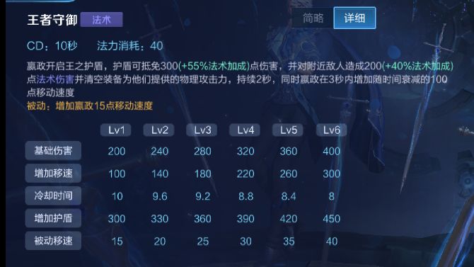被动是普通攻击是法术伤害,并且带有穿透效果,拥有同时攻击一条线的敌人,而且普通攻击的法术伤害是与法强有关。一技能选定一个范围释放剑阵,造成持续的法术伤害,并且减少敌人30%的移动速度。二技能增加一个护盾并且短暂增加嬴政的移动速度,对旁边敌人造成法术伤害,关键之处在于还可以使自身范围内敌人失去装备的物理攻击力加成2秒。大招是选择一个方向攻击,一共90支箭。开启大招同时,增加20%移动速度,可以使用其他技能。