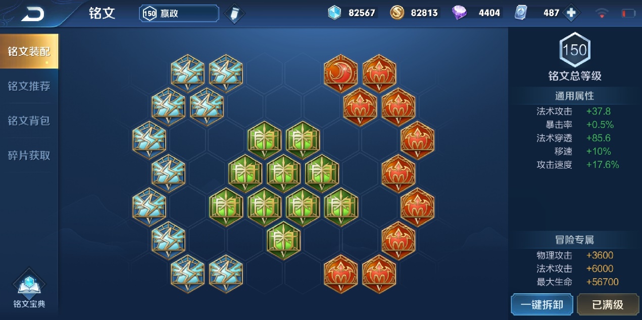 铭文效果是增加法术攻击力与法术穿透,可以对敌人造成更高的法术伤害,而移速可以增加嬴政的机动性,也可以使大招更容易命中敌人。攻击速度的加成对于嬴政的普通攻击有很好的效果。可能很多人都对一个红月有问题,这是结合嬴政阈值来达到最适合嬴政的攻击速度,在这里就不详细说这个了。配合出装可以打出更好的效果。