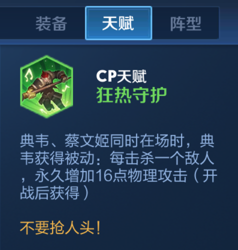 各位亲爱的召唤师们大家好,随着王者模拟战自走棋模式上线正式服,无数玩家对此乐此不疲。愈来愈多的玩家变成了“棋手”,为了吃鸡也在绞劲脑汁开发套路。王者模拟战中天赋加成是十分重要的,其中不受重视的冷门天赋它的强度有很多召唤师还不了解。今天就来给大家详解一下冷门天赋如果用的好也会强于s级。 王者模拟战中,天赋有38个,D级5个,C级9个,最多的还是B级15个,A级6个,最高级别S级3个。每个天赋都有其作用,有的适用场景多用的多,有的适用场景少用的少,没有一个是无用的,但是还存在常用和冷门之别。今天我们就来聊聊那些冷门天赋,用得好为什么比s级天赋还好? 狂热守护 ? 天赋等级:C级 天赋类型:CP天赋 描述:典韦、蔡文姬同时在场时,典韦获得被动:每击杀一个敌人,永久增加16点物理攻击(开战后获得) 适用阵容:6魏国+4辅助(或6魏国+4战士+2辅助)、7长城+典韦+蔡文姬 装备选择:抵抗之靴(核心) 分析:目前作者还没有测出可叠加上限,但是最大伤害测到可以达到8000多,而且可以2个相同天赋叠加效果不冲突,也就是1乘2的效果。所以要想以最大化激发这个天赋的效果最好是以典韦为核心的阵容。 6魏国+4辅助(或6魏国+4战士+2辅助)这个阵容核心输出可以往培养典韦方向靠,阵容可以增加典韦的护甲和法术防御,提升典韦坦度,让典韦不是那么容易被秒。6魏国护盾触发几率很高,典韦又有了保命的一种手段手段。蔡文姬又可以回血,保护能力还是很强的。阵容的收割能力不是很强,爆发很低,所以靠持续性输出的典韦可以很容易把天赋叠起来。辅助的韧性和抵抗之靴的韧性叠加,让典韦被控制时间很低,保证典韦能打出应有的输出,不会遇到控制多的阵容的时候被迫当“战神”。但是这套阵容很依赖典韦发育,3星典韦血量又低,一旦被秒,赢得几率很小,所以作者都是肉典韦带个名刀或复活甲。 7长城+典韦+蔡文姬献祭流玩法,7长城献祭后可以全方位的提升典韦63%属性(最近更新削了),典韦的属性得到极大的强化,而且敌方也剩下了很多残血,典韦一击叠一层被动,属性蹭蹭的往上涨。但是现在长城被削了,要玩献祭流典韦很难了,还是6魏国典韦稳定点。 相依为命 ? 天赋等级:D级 天赋类型:相依为命 描述:守约、玄策同时在场时,自身生命值每损失5%,额外造成5%伤害 适用阵容:7长城+3刺客 装备选择:影刃、无尽战刃、泣血之刃(或破晓或闪电匕首) 分析:目前能最大化这个天赋效果的只有7长城+3刺客阵容,核心以百里玄策为主。这个阵容到9人口,8个都是拿来献祭的,可以提升72%属性,百里玄策攻击和攻速都能达到一个恐怖的数值,1秒4下每下5000+伤害,只见屏幕上百里玄策跳来跳去。但是想要达到这个层次,装备是必不可少的,影刃提供25%暴击和50%攻速,无尽20%暴击和40%暴击效果,剩下的那件可以看看天赋有没有吸血的,没有就泣血之刃,有就选择破晓或者闪电匕首,再配合上3刺客buff,暴击最少能达到60%,暴击效果270%,不说每下暴击,4下3次暴击还是有的,无限秒人。 总结 总之,冷门天赋了解的人非常少,要想让这些低等级天赋发挥超出s级天赋的效果必须要玩点套路阵容,但是这些阵容很危险,一不小心就会被踢出局,所以这些天赋的使用需要在特定时候特定搭配会有奇效,一般状态可不建议一直使用哦,最后祝大家在自走棋模式中把把吃鸡。 如果您想了解更多王者荣耀自走棋王者模拟战的内容,请关注 叶子猪王者模拟战专区