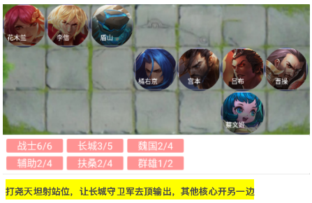 各位亲爱的召唤师们大家好,随着王者模拟战自走棋模式上线时间的推移,各种新套路阵容层出不穷,大家从一开始的学习系统推荐阵容到自主开发适应版本的新套路,今天就给大家推荐自从模拟战模式更新以来的强力阵容——精英守卫战士流。 一、阵容组成: 3长城:李信 花木兰 盾山? 6战士:曹操 吕布 宫本 橘子 李信 花木兰? 2辅助: 蔡文姬 盾山? 8人口完全成型。 最穷最贵最难玩,但成型非常强,点羁绊进阶天赋厉害,6战士羁绊加350防御进阶成8战士加700防御,特别适合对抗蜀卫刺和尧天坦射阵容,基本进阶8战士后都打得过,不会像上个小版本那样,打不过尧天坦射,有时候也打不过蜀卫刺。 二、阵容组成图解&&站位教学: 1、常规站位: ? ? ? 2、打尧天坦射站位,让长城守卫军去顶输出,其他核心开另一边: ? ? 三、打法细节: 1、强势点: (1)6战士提供巨额护甲加成,后期不怂尧天坦射 (2)吕布带名刀,破军,无尽或者刺客旗帜,伤害控制拉满 (3)3星蔡文姬提供稳定生命恢复 (4)扶桑的两位战士自带真实伤害,不吃装备? 主要升星英雄2星吕布>3星曹操=3星橘子=3星蔡文姬>3星宫本(太贵合不起) 2、弱势点: (1)同行多,难胡牌,会被法师,稷下扶桑,6魏国乱入? (2)稷下扶桑,6魏国,本身就和守卫战士同行,难拿牌 (3)很不理解的,成型也打不过同质量的稷下扶桑? (4)稷下扶桑打不过尧天坦射,守卫战却做得到... 【综上所述】: 扶桑稷下属于天敌,最好在没人玩扶桑稷下的情况去玩精英战,扶桑造成的真伤,无视6战士的护甲加成, 只有高质量的精英战士才很勉强的打过。 3、备注 : 打法师的时候,拉9人口下一个战士,没必要凑6战,凑4个辅助打,免控,减法伤 打刺客的时候,拉9人口下奶妈(或者拿战士旗给奶妈),凑8个战士打,防御+350直接翻倍+700防御 4、过渡方法,有3种: (1)两稷下 上2星英雄,复制两星打连胜 (2)长安卖血拿战士,攒钱 (3)天胡魏国开局 全两星打连胜,后期再转精英战 ,4魏国4战士全两星不遇到高质量法师,基本稳连胜? 5、关于天赋选择: (1)有同行:有牌情况下,特价>倒卖>战士天赋>其他随便选,有“失败经验”和“主动技能”都能拿。 (2)无同行:一直连胜情况下,优先拿战士天赋增加输出保连胜也可以 6、关于装备: 破军,名刀,刺客旗帜(吕布专属)!!(“蹦迪流”吕布起飞!) 刺客旗帜,强势在于瞬间跳跃,①直接切人,②增加暴击,③真伤也是能够暴击的!? 总之,战士本身属于能抗能打越拖后越强的阵容,提供的物抗也十分克制射手爆发的阵容,但是没有阵容是万能的,战士对于法师阵容还是比较忌惮的。所以更多的玩法和搭配还请大家多多在排位实战中进行探索噢。 如果您想了解更多王者荣耀自走棋王者模拟战的内容,请关注 叶子猪王者模拟战专区