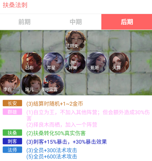 各位亲爱的召唤师们大家好,王者模拟战自走棋模式一直受众多玩家所喜爱,随着玩家在排位的不断活跃,各种搭配也层出不穷,众所周知英雄的排名是分等级的,越高等级象征着越全年的特性,在模拟战中有个阵容也可称为T0级别,今天就给大家详解扶桑法刺阵容。 1、阵容组成: 【3刺客】:上官婉儿,李白,娜可露露 【5法师】: 武则天,弈星,貂蝉,火舞(甄姬或者墨子) 拿【羁绊进阶(进阶人数最多羁绊)】5“法师”羁绊变“7法师“ 【2群雄】: 吕布,貂蝉加入【扶桑】凑羁绊【4扶桑】 2、阵容核心: 这个阵容依赖:【3星上官,2星武则天,2星吕布】 完全成型时:【4扶桑·7法师·3刺客】(有羁绊进阶天赋情况下) 3、阵容组成图解: 4、对局阵容实战示例·高端局连胜战绩: ? 二、Why·扶桑法刺为啥变强? ? 腿哥点评-主要原因分析: ? 1、新天赋·羁绊进阶: 加速了长安攒钱速度:5长安→7长安 快速攒钱→快速升人口→升8人口抢卡,抢武则天·吕布 快速攒钱→加速法师英雄升级2星 加速了法师阵容成型速度:5法师→7法师 2、快速成型的4扶桑,全员真伤Buff较难克制 吕布,貂蝉加入【扶桑阵营】,快速凑齐【4扶桑】全员真伤Buff 三、How·过渡方法,以及打法细节? ? 1、过渡方法: (1)【前期过渡】长安过渡 前期3长安卖血,换免费刷牌机会,刷长安牌出来 过渡5长安攒钱 等待选择天赋→“羁绊进阶”:让“5长安”变成“7长安” 7长安,加速攒钱速度 长安攒钱尽早升级8人口,刷牌抢牌拿“武则天,吕布” (2)【中期雏形】撤掉长安,换成扶桑法刺英雄 刷扶桑法刺的卡牌,慢慢升级2星 逐渐换掉长安牌,换成扶桑法刺英雄 (3)【阵容后期】凑齐阵容,升星·提升英雄质量 阵容核心:3星上官婉儿,2星武则天,2星吕布 2、打法细节: (1)天赋选择: 必拿!羁绊进阶 根据阵容情况来选择天赋 (2)装备选择,装备分配: 装备选择: 【保命装备】:名刀司命,炙热支配者,辉月等。 【法术装备】:回响之杖、虚无法杖;博学者之怒、贤者之书等。 前期法术装备:回响之杖,虚无法杖 后期法术装备:博学者之怒,贤者之书 装备分配: 【保命装】:吕布,武则天,上官婉儿 名刀司命:可以分配给1星武则天,1星吕布 炙热支配者:武则天,上官婉儿 【法术装备】:武则天,上官婉儿 前期法术装备:回响之杖,虚无法杖 后期法术装备:博学者之怒,贤者之书 (3)站位问题·常规站位: 四、精品教学 ? 【扶桑法刺教学①-④】 扶桑法刺教学①!扶桑法刺3星李白3星弈星3星甄姬,武则天一大定江山 ? 扶桑法刺教学②!扶桑法刺雷霆剑道3星武则天宫本李白甄姬上官,武则天一大融化星耀段 ? 扶桑法刺教学③!王者前200高分局,扶桑法刺翻车变翻盘3星李白3星上官 ? 扶桑法刺教学④!扶桑法刺对抗嘲讽型玩家双狂热快乐典韦3400攻击 星耀段 ? 【克制扶桑法刺教学①-③】 克制教学①:精英战3星宫本带飞大战版本t0扶桑法刺3星李白 ? 克制教学②:蜀卫刺3星玄策张飞裴擒虎赵云大战扶桑法刺3星武则天上官!星耀段 ? 克制教学③:精英守卫战对抗法刺3星上官,尧天刺3星玄策阿离赵云 ? 总之,扶桑法刺阵容不仅克制护盾打出真伤,也对热门的战士流阵容有奇效,但同样,没有无敌的阵容,刺客阵容也有着自身的缺陷,所以想要吃鸡还需要大家在实战中根据实际情况来搭配噢。 如果您想了解更多王者荣耀自走棋王者模拟战的内容,请关注 叶子猪王者模拟战专区