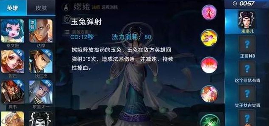 1技能:嫦娥释放捣药的玉兔,玉兔在敌方英雄间弹射3-5次,造成法术伤害,并减速,持续性掉血。