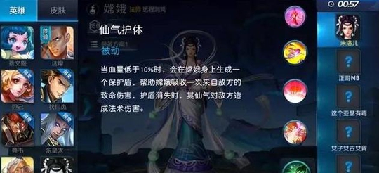 被动:当血量低于10%时,会在嫦娥身上生成一个保护盾,帮助嫦娥吸收一次来自敌方的致命伤害,护盾消失时,其仙气对敌方造成法术伤害。