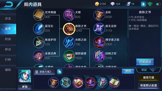 出装详解:这套出装的抗压能力比较强。圣杯在前期拿不到蓝buff时很有帮助,避免因为缺蓝频繁回家,提高了王昭君前期的续航能力,王昭君没有位移技能,选择抵抗之靴可以减少被控制的时间,提高生存能力。噬神之书提高伤害,减少技能冷却时间,增加生命值,被动还能提供吸血,从各方面提升了王昭君的伤害能力、生存能力、续航能力,博学者之怒保证王昭君在中后期能够有秒人的能力,痛苦面具让王昭君的伤害能够打得动敌方前排英雄,贤者之书则是增加了后期王昭君的生存能力。