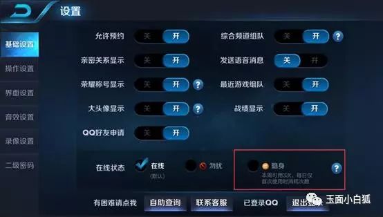 隐身功能集成在基础设置中,默认为在线状态,需要手动使用隐身功能,隐身功能每周只能开启任意三天。