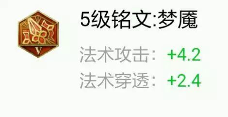 梦靥对比五级铭文圣人,梦魇属性是2.4法穿+4.2法攻,圣人只有5.3法攻。