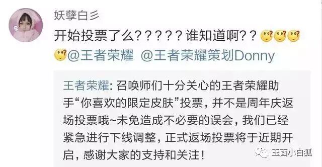 因为官方在9月19日刚预热:近期会举行限定皮肤返场投票,玩家的惯性思维直接就误以为这个就是限定皮肤投票,然后就很自然的被当成了返场投票,当外界流传的返场投票消息被官方看到,于是乎,官方为了避免误会,赶紧撤回了这一次互动话题,妲己宝宝在评论中也解释了这一事件的缘由!