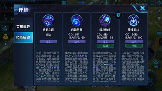 一技能可以召唤黑暗能量体,对附近地热能造成法术伤害,黑暗能量体的数量决定了二技能造成的伤害高低,最多三颗。命中敌人后还会返还一技能一半的CD时间,东皇太一可以频繁使用一技能保持身边拥有不低于两颗的黑暗能量体,让二技能能打出更高的伤害并吸血。