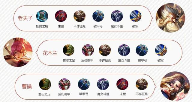 根据目前的版本,花木兰是上单一霸,拥有不错的清兵能力。老夫子则是偏向功能性的先手英雄。曹操不论是在高端排位还是职业比赛都有着稳定的出场率,是能抗能打的代表英雄。