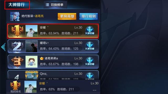 这位玩家的诸葛亮在大神吧排行上还是排第一的呢