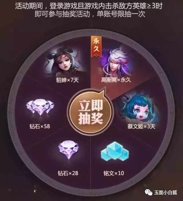 活动内容:在游戏内击杀3个敌方英雄,即可参与高渐离抽奖活动,每个账号只能抽取一次。