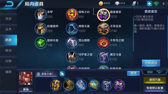 第一套出装:红莲斗篷、影忍之足、不死鸟之眼、不祥征兆、反伤刺甲、霸者重装