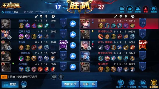 看看最终的数据:17:27相差整整十个人头,妲己一个人死了六次,估计这妹子要气的摔手机了。