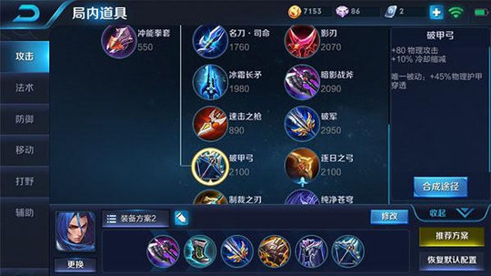 第一套出装:暗影战斧、抵抗之靴、破军、不祥征兆、魔女斗篷、破甲弓