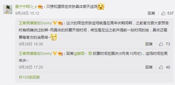皮肤返场是在周年庆,投票时间是在9月底和10月初!