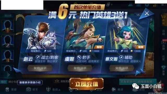 虞姬和蔡文姬虽然没有赵云那边珍贵,但是也是强势英雄行列,虞姬更是本赛季最热门射手,蔡文姬也是热门辅助。三个英雄分别代表了前排、中排和后排,刚好补齐玩家对各个位置的需求,喜欢输出换虞姬,喜欢肉盾的换赵云,喜欢辅助的换蔡文姬。不过仔细一想,首充六元必选赵云啊,不然没有首充之后,还需要使用588点券去购买,多不划算啊,而其他英雄还可以使用金币购买。