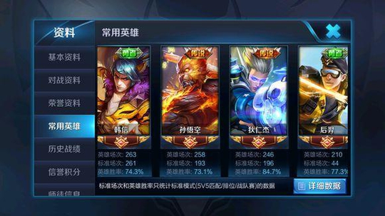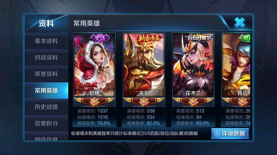 这位玩家目前段位是王者48星,常用英雄貂蝉、关羽、花木兰、韩信。貂蝉总场数1337,胜率高达79.5%,关羽五百多场,胜率80%,其他英雄的胜率也在70%左右。