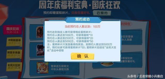 点进来之后,别忘记要点愉悦这个按钮,按照图片所提示的,当预约人数达到5000万的时候,可以获得50枚蛋糕碎片,估计这个道具之后是用来换铭文碎片或者皮肤和英雄碎片的吧。