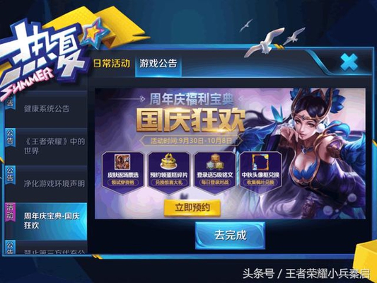 十月一日登录游戏后,从游戏公告中找到周年庆活动,然后点击去完成,可以进入国庆狂欢的页面。