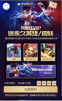 临近十月,腾讯视频VIP宣布携手王者荣耀,借王者荣耀两周年庆典,推出“腾讯视频VIP王者专区10月特权”活动,将游戏中的大热新皮肤和新英雄,通过开通腾讯视频VIP的方式回馈给用户。
