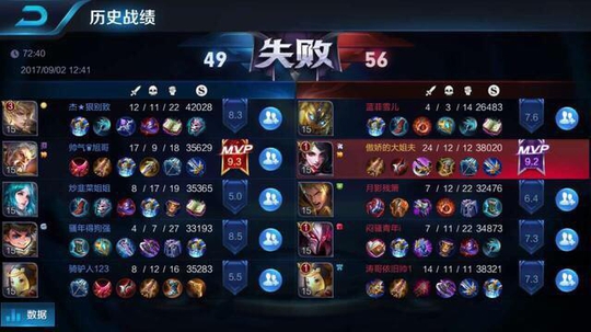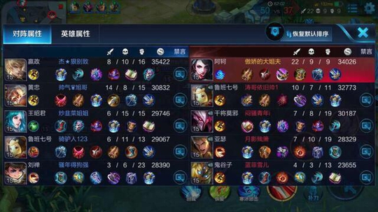 从数据中可以看到,双方经济都达到了三万,装备换了一件又一件,我方终于熬不住了,鬼谷子和鲁班直接挂机,妹子和其他三个队友默默点了投降。