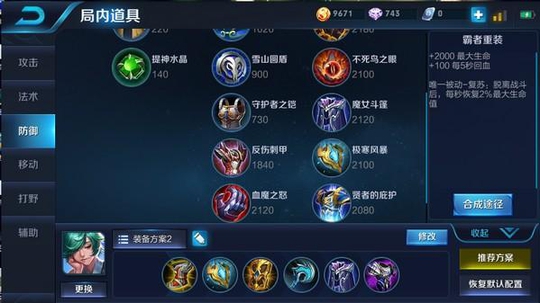 六神装:疾步之靴、极寒风暴、近卫荣耀、冰霜法杖、魔女斗篷、霸者重装(奔狼纹章)