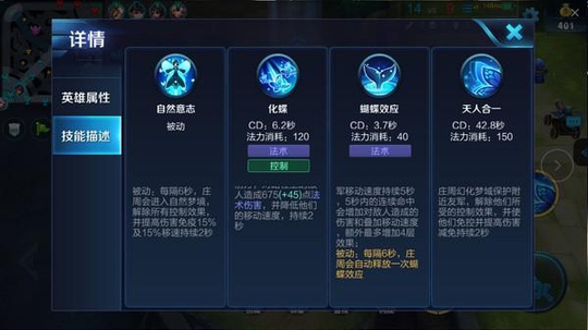 自然意志(被动):庄周的被动能够解除自身控制,并提高自身及周围友军的移动速度,被动每隔一段时间便会触发一次,是庄周生存能力的一大来源,也使得庄周在团战中起到的作用更大。