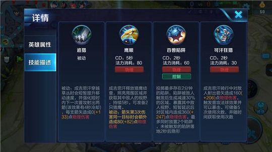 一技能提高了成吉思汗的防gank能力,成吉思汗向指定方向释放鹰眼侦查敌情,照亮一片区域并获取区域内敌人的视野持续一段时间,成吉思汗最多可准备两只猎鹰,前期对线时成吉思汗可以用一技能来检测敌方打野的动态,提高自己和队友的安全,此外该技能还有个被动,在鹰眼第三次命中同一个敌人时,会造成物理伤害,团战时尽量命中同一个敌人造成更高的伤害。