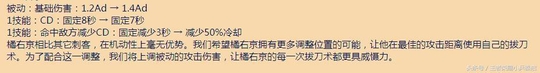 首先是被动伤害增加,其次1技能的CD减少一秒。而且一技能这次命中敌人直接减少50%的冷却,相当于变相增强了橘右京的唯一能力和快速输出能力,让橘右京作为一名战士,威胁性更强。