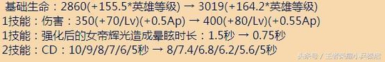 首先是基础生命值增加,其次是调高了一技能的伤害,但是稍微降低了控制效果,2技能的CD时间更短。算是一波大加强。