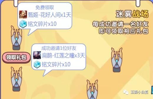 今日游戏内还上线了一个活动,邀好友得皮肤、碎片,注意了,是皮肤(体验卡)+(铭文)碎片,大家别想多了。天美一般不标注永久皮肤和永久英雄,都是没有永久皮肤和永久英雄赠送的,既然是宣传,肯定要宣传最好的奖品。