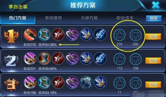 系统推荐方案中的热门装备方案将引入新的算法,依据胜率、评价定期刷新!