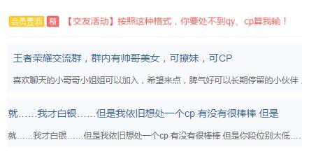 不知道各位在玩王者荣耀的闲暇时间还会不会逛其他王者荣耀论坛或者贴吧,很遗憾的是在这些地方我们往往很少能找到自己想要的信息,取而代之的被各种“求CP”、“处对象”的消息霸屏。