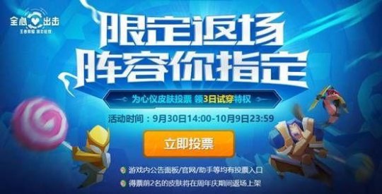 前段时间,《王者荣耀》推出了限定皮肤返场投票活动,在经过一段时间的玩家投票后,现在已经敲定了周年庆期间将会返场出售的三款皮肤,下面我们就来一起看看吧!