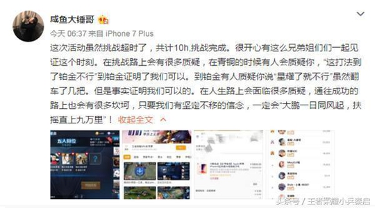 不过,算上游戏等待的时间以及一些不可控的因素,这一次八小时的挑战赛并没有在预定时间内完成,而是延迟到十个小时,最终,大锤哥成功从青铜段位打到王者段位。