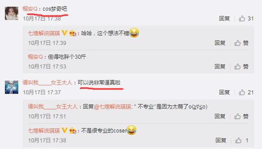 小编以为,这是波颜值盖过演技的cos,因为琪琪的cos更多的是可爱,而少了孙尚香自身性格里的傲娇、自负。不过抛去与原皮肤的对比,琪琪cos的孙尚香真是美得让人沉醉。官方解说瓶子就按耐不住评论了一波。