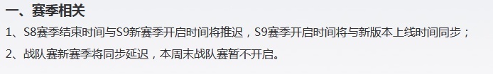 根据官方公告显示,这次的赛季结束时间、新版本发布时间都将会受到影响,而且战队赛的新赛季将同步延迟。