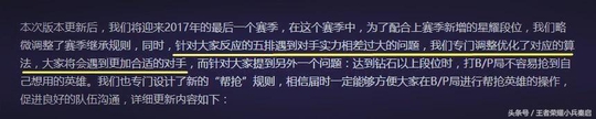 针对这类五排遇到对手实力相差太大的问题,下个赛季就会更改算法,不能让星耀的五黑匹配到青铜的玩家。