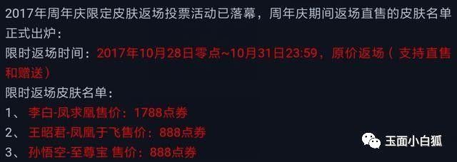 10月28日限定皮肤返场开售,至尊宝、凤求凰、凤凰于飞商城上架,全部原价出售。之前流传着至尊宝不出的谣言,请大家切勿轻信!