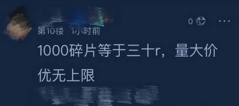 而且甚至有玩家在贴吧直接做起了生意,30元换1000碎片,如果没有这个bug,算一算还真不贵。